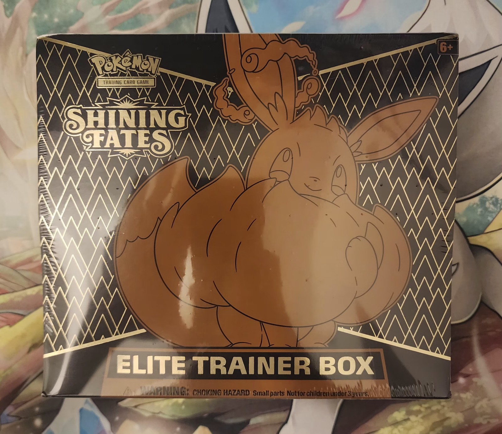 Card Text:Each Shining Fates Elite Trainer Box includes 10 Shining Fates booster packs, one foil promo card featuring Eevee VMAX, and various gameplay accessories.